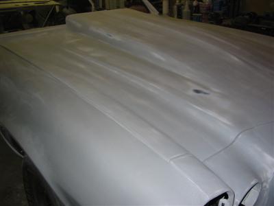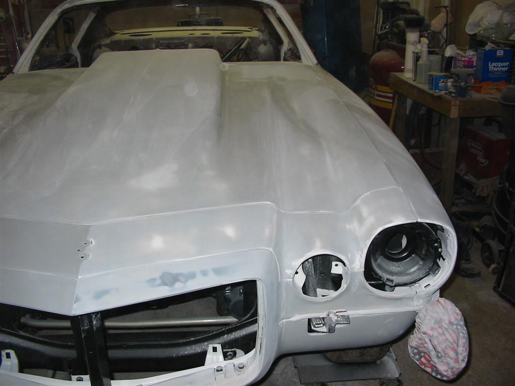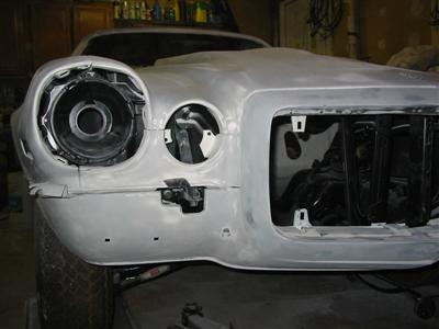 | Here are some in progress shots of the hood and header panel. The left half is done the right