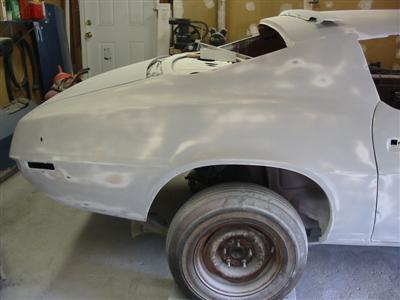 shows the fender with the drycoat sanded off and the fender flat and smooth. |