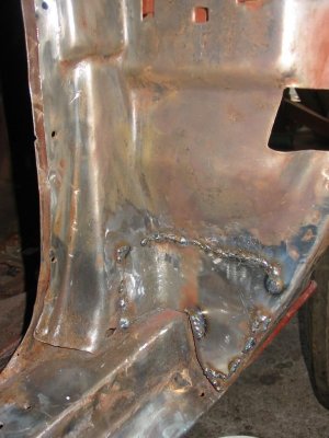 Left Door Pillar Repair and Rear Undercarriage Stripping (September 1, 2004)Here are pictures of the repairs done the the drivers side inner door panel and surrounding area. These repairs are not of my best looking patch panels, but all these repairs get hidden by the quarter panel. It is actually a good place for me to get some practice.I am also in the process of stripping all the undercoating and loose rust from the rear frame rails and rear floor area under the trunk and behind the back seats. This is being accomplished with wire wheel brushes, scrapers, Eastwood undercoating remover and carb cleaner. I hope to strip this area clean then coat with ZeroRust. There is also a couple of pictures of rust holes in the floor. These are located between the back seats and front seats on the side. These are small and will be patched. Status photos as of 9/1/2004: |
