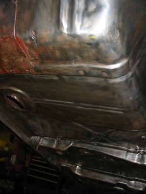 Firewall Smoothing and Front Undercarriage Stripping and Coating (June 14, 2006)This page documents the stripping of the undercarriage from the rear framerails forward and the smoothing of the right side of the firewall. Of all the jobs that I have had to do for this restoration, stripping the floorboards of undercoating, rust, paint and road grime was the absolute worst. I used a 4 inch grinder with a knotted wire wheel to strip the undercoating. I used paint stripper to remove and soften the primer before hitting it with the wire wheel too.Stripping the firewall was a much easier task. The paint came right off with aircraft stripper and then the wire wheel brush. In the photos you will see that I am going to weld a steel cover over the right side of the firewall. This will cover all the holes from the factory AC system. I am doing this to make some space under the hood. The factory AC system is huge, inefficient and takes up a lot of space in the engine compartment. I plan on using an aftermarket hot rod system like a Vintage Air unit. These units are completely self contained and sit in the passenger compartment behind the dash. The only issue in putting the cover on was in the center area. The factory firewall has a couple of raised ridges in the center. I had to cut these out so my panel will sit flush. Status photos as of 6/14/2006: |