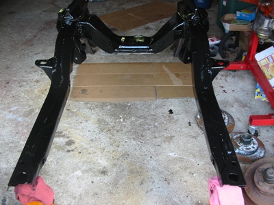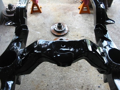 | Here are pictures of the completed subframe coated with gloss black POR-15. |