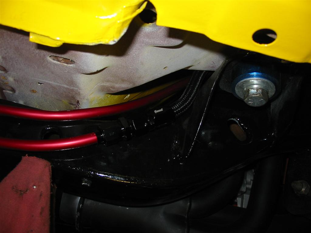 moves to the inside at the end of the front frame rail. NHRA rules requires hard lines to