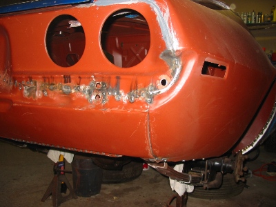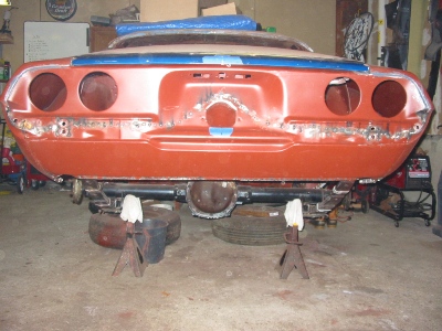 Tail Panel Install (August 25, 2005)Here are the pictures of the Tail Panel replacement. I have owned the Tail Panel and Quarter Panels since purchasing them from GM in 1989. I have finally installed them 16 years after buying them and over 2 years since I started this restoration project up again. All I have left on the rear of the car is the grinding down of all the welds and the final body work. All metal repairs are finally done. This is the first time I have ever seen my car all steel. When I bought it, it was mostly fiberglass and bondo in the rear.I mounted the Tail Panel using a combination of body panel adhesive and plug welds. I used the adhesive to mount the Tail Panel to the Quarter Panels near the Tail Lights. The rest was welded. Also pictured here is the final finishing of the Inner Valence. I coated the Inner Valance with ZeroRust and sealed up all my welds with Seam Sealer. Hopefully this car will never rust again in my lifetime. Status photos as of 08/25/2005: |