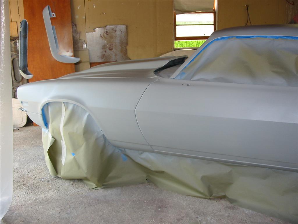 I removed the bumpers and spoiler, scuffed up all the epoxy primer, cleaned the car off and taped up