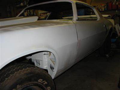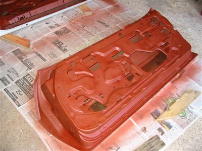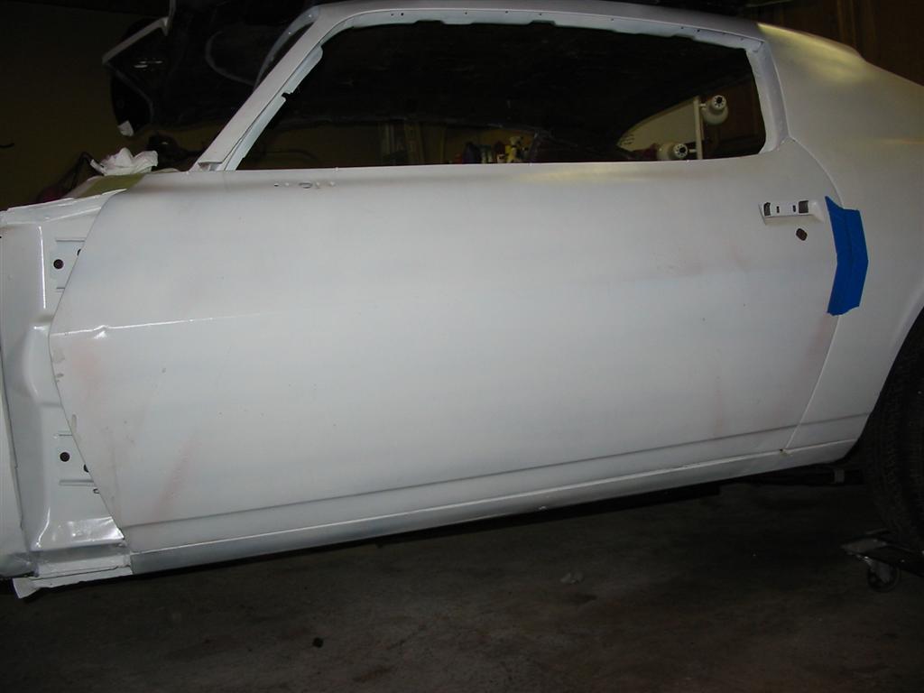 | Here is the left side door area. The grey primer is coating the area where I filled two holes that