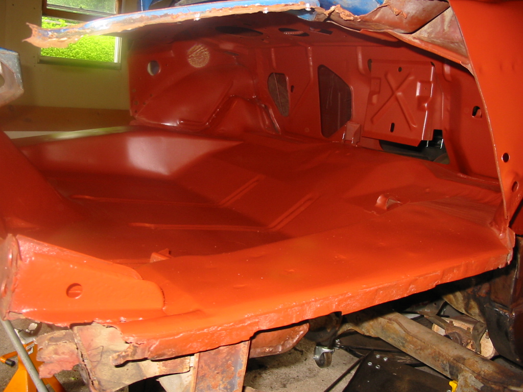 | Here are a few shots of the trunk stripped and sealed with POR 15 sealer. |