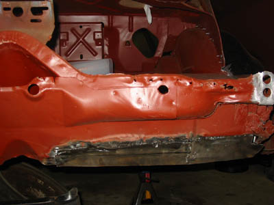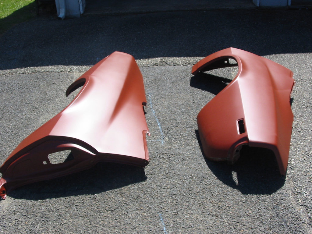 | Here are a few shots of the rear quarter panels after being stripped and primed. The left rear quarter panel
