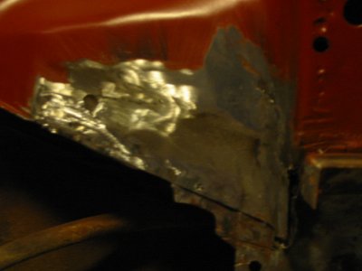 Here is the patch that I cut from a piece of sheet metal and bent to fit the contours of the wheel well. |