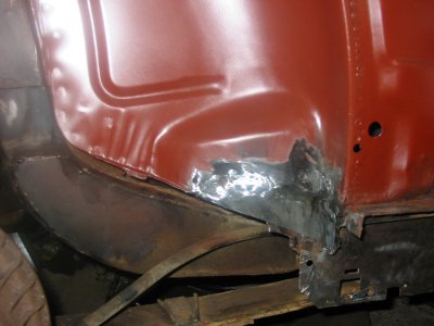 | Here is a picture of the area behind the right rocker panel. I removed the old rocker panel and cleaned off most of the